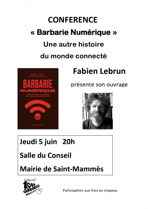 Sur l'invitation du collectif 1000 sabords, Fabien Lebrun présentera Barbarie numérique à partir de 20h dans la Salle du conseil de la Mairie de Saint-Mammès (2 rue Grande, 77670 Saint-Mammès).