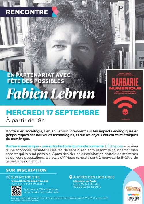 En partenariat avec Fête des possibles, Fabien Lebrun présentera Barbarie numérique. Une autre histoire du monde connecté à partir de 18h à la Librairie de Paris (6 rue Michel Rondet, 42000 Saint-Étienne).