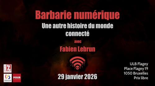 Sur l'invitation de Pour et d'ATTAC, Fabien Lebrun présentera Barbarie numérique. Une autre histoire du monde connecté à partir de 19h30 à l'ULB Flagey (Place Flagey 19, 1050 Bruxelles).