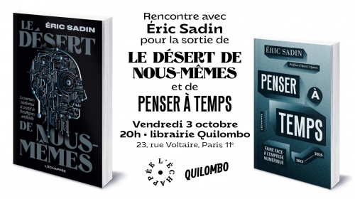 Éric Sadin présentera Le Désert de nous-mêmes. Le tournant intellectuel et créatif de l’intelligence artificielle à partir de 20h à la librairie Quilombo (23 rue Voltaire, 75011 Paris).