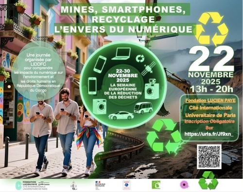 Dans le cadre de la Semaine Européenne de la Réduction des Déchets (SERD), LIDDFC organise une conférence intitulée "Mines, smartphones, recyclage: l'envers du numérique", pour comprendre les impacts du numérique sur l’environnement et les droits humains en République Démocratique, avec Fabien Lebrun, auteur de Barbarie numérique. Une autre histoire du monde connecté à partir de 18h à la Cité Universitaire de Paris (17 bd Jourdan, 75014 Paris).