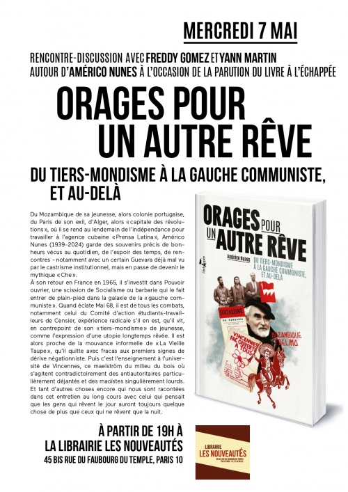Yann Martin et Freddy Gomez présenteront Orages pour un autre rêve d'Américo Nunes à partir de 19h à la librairie Les Nouveautés (45 bis rue du Faubourg du Temple, 75010 Paris).