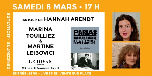 Marina Touilliez et Martine Leibovici présenteront Parias. Hannah Arendt et la « tribu » en France (1933-1941) à partir de 17h à la librairie Le Divan (203 rue de la Convention, 75015 Paris).