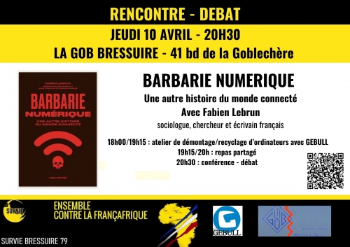 En partenariat avec l'association Survie, Fabien Lebrun présentera Barbarie numérique à partir de 20h30 à La Gob Bressuire (41 boulevard de la Goblechère, 79300 Bressuire).
