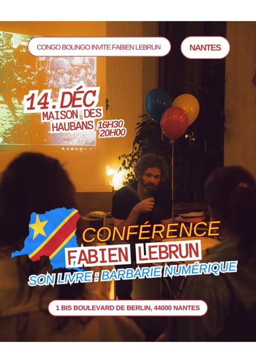 Sur l'invitation du collectif Congo Bolingo, Fabien Lebrun présentera Barbarie numérique. Une autre histoire du monde connecté à partir de 16h30 à la Maison des Haubans (1 bis boulevard de Berlin, 44000 Nantes).
