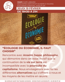 Anselm Jappe présentera Écologie ou économie, il faut choisir à partir de 19h30 au café-librairie Youpi (26 avenue Saint-Ruf, 84000 Avignon).